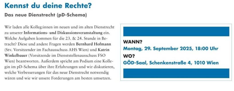 Somit kann das eine interessante Veranstaltung für junge und erfahrene Kolleg:innen aller Schultypen werden, also alle, denen ein verbessertes Dienstrecht ein Anliegen ist.