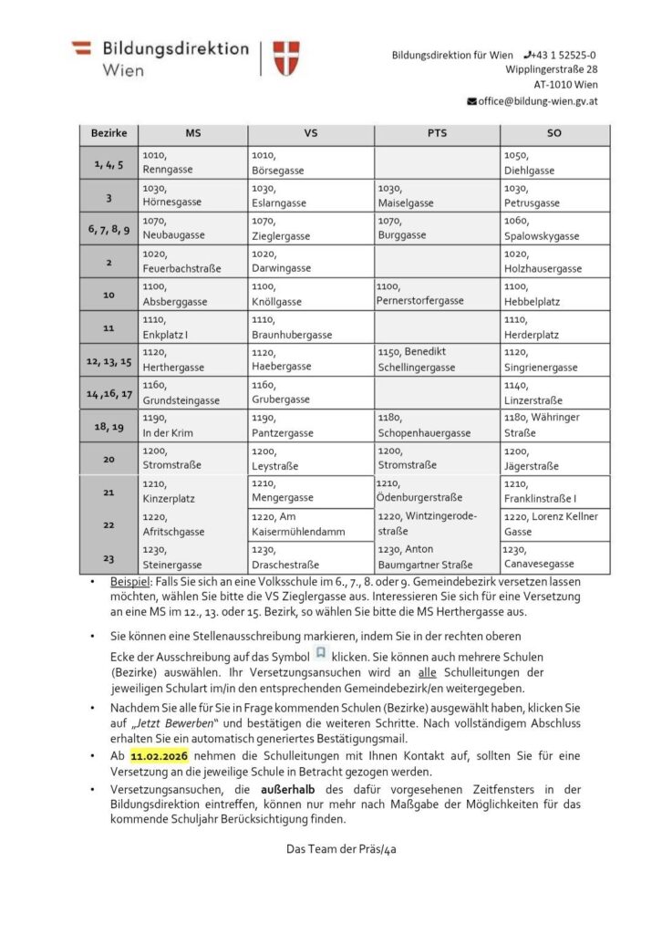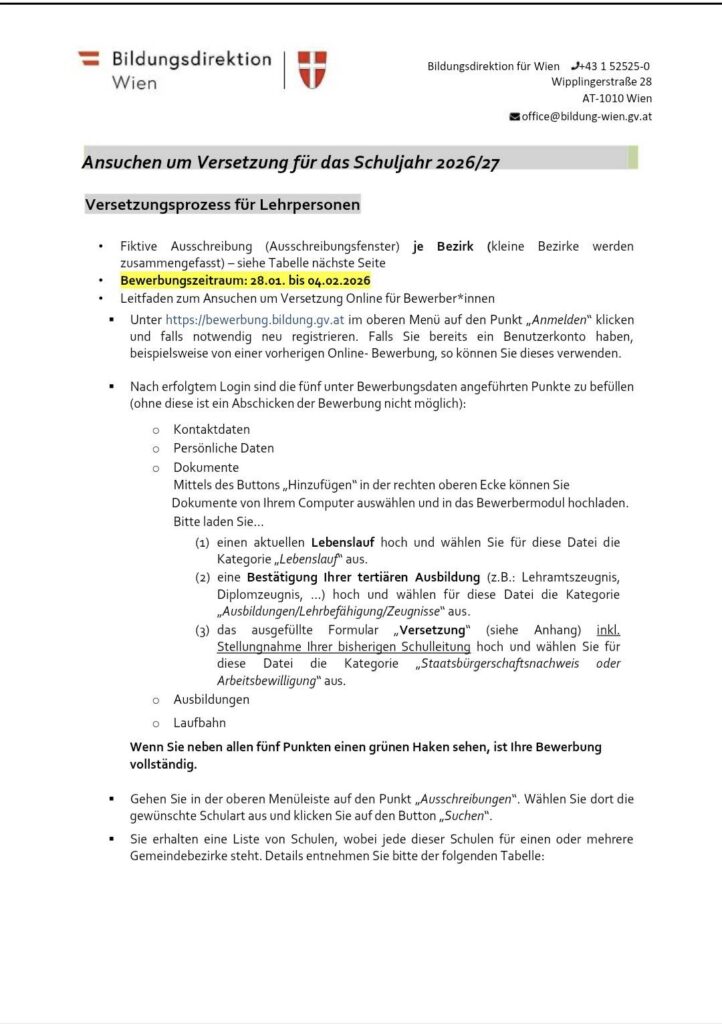 Die Versetzungen für 2026/2027 starten nächste Woche! Im Zeitraum vom 28.1.2026-4.2.2026 sind Versetzungen möglich, sie laufen über bewerbung.bildung.gv.at/